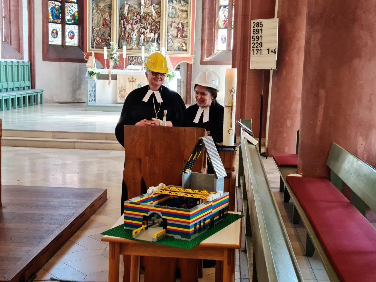 Zum Abschluss der Synode wurde ein Abendmahlsgottesdienst in der Stadtkirche gefeiert. Dekanin Brecht und die stellvertretende Dekanin Monika Bogendörfer nahmen in ihrer Predigt das Bild auf, dass Kirche ein Haus ist an dem immer gebaut wird. Beherzt zogen sie Bauhelme auf, um zum Mitbauen einzuladen: „In der Kirche gibt es viele kostbare, kunstvoll gestaltete und wunderschöne Bausteine. Jeder Mensch, der sich für die Kirche engagiert, ist ein solcher. Schließlich lebt die Kirche davon, dass sie ein Haus aus lebendigen Steinen ist.“