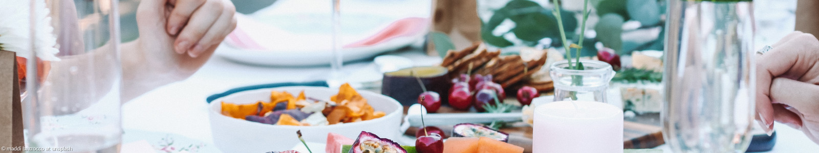 Snacks mit Früchten auf Tisch im Garten