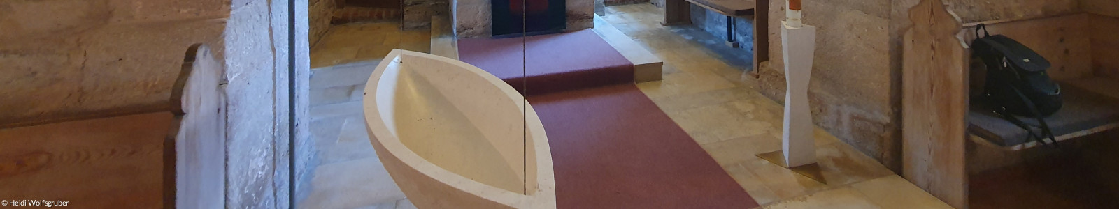 "An welchem Platz in der Kirche will ich stehen?" - mit dieser Frage erkundete das Team "Unser kleiner Gottesdienst" mit mir als Pfarrerin die kleine Kirche in Rennhofen. Am Anfang gab es eine kurze Einführung von Peter Mechs vom Mesnerteam, der extra gekommen war, um die Kirche aufzusperren und einen kleinen Einblick in die Geschichte der Margaretenkapelle zu geben. Diese hat als Besonderheit ein modernes Taufschiffchen, das vor einigen Jahren von einer Tauffamilie gespendet wurde.