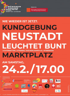 Bildrechte Bündnis gegen Rechts Save the date: "Neustadt leuchtet bunt" Kundgebung auf dem Marktplatz am Sa, 24. Feb 2024, um 17 Uhr Das Dekanat Neustadt a.d. Aisch und die Evang. Jugend im Dekanat Neustadt sind mit dabei!